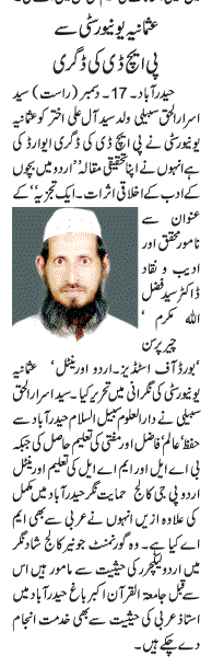 Published 14/01/2015 مولاناآزاد نیشنل اردو یونیورسٹی سے اردو میں پی۔ایچ۔ڈی محترمہ بدر سلطانہ کو پی۔ایچ۔ڈی ایوارڈ Share this:FacebookX